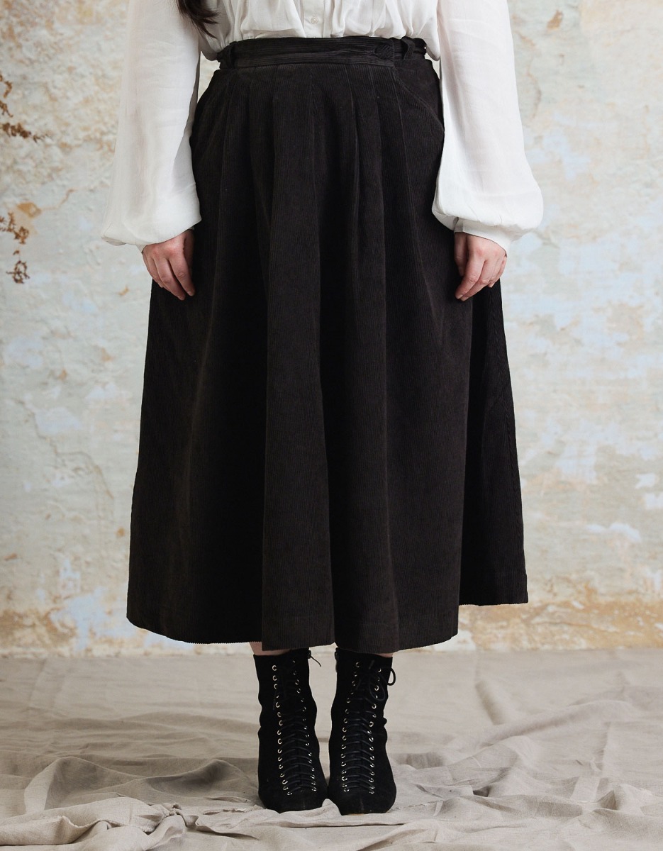 La jupe « Yana » est réalisée dans un velours côtelé de grande qualité. Ce tissu, lourd et consistant, possède un tombé ferme et élégant.
